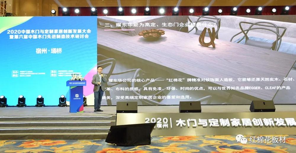 2020年10月17日,2020中國(宿州)木門與定制家居創(chuàng)新發(fā)展大會暨第六屆中國木門先進(jìn)制造技術(shù)研討會,在安徽宿州隆重開幕,耀東華公司董事長曾敏華先生受邀出席,作《高端飾面人造板助推高端定制和生態(tài)門業(yè)發(fā)展》主題報告,并參與嘉賓訪談,分享耀東華公司在圍繞產(chǎn)業(yè)高質(zhì)量發(fā)展與產(chǎn)業(yè)鏈協(xié)同創(chuàng)新方面的實戰(zhàn)舉措和實踐經(jīng)驗。