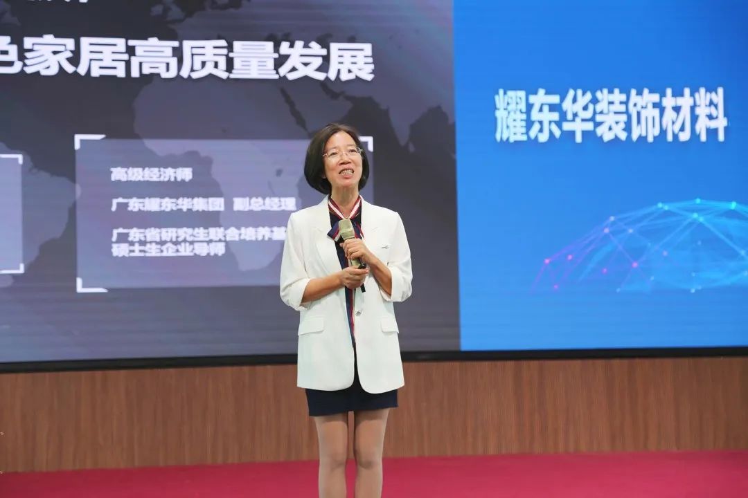 耀東華集團(tuán)副總經(jīng)理吳惠娟以“智造高端飾面板 助推綠色家居高質(zhì)量發(fā)展”為主題,從“企業(yè)簡介”、“從飾面板、家居產(chǎn)業(yè)鏈談高質(zhì)量發(fā)展與企業(yè)家精神”兩方面論證主題,最終以高端飾面板品牌方的角度傳達(dá)了對未來綠色家居生態(tài)鏈的展望,贏得了在場會(huì)員代表的點(diǎn)贊。